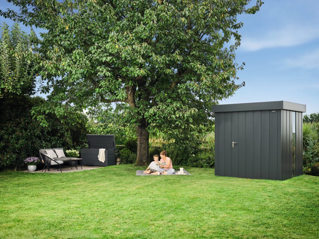 Sowohl innen als auch aussen lassen sich die Gerätehäuser mit praktischem Zubehör individuell erweitern. Im Rahmen der Aktion werden das Gerätehaus Juno Modern mit Flachdach und die Juno-Gartenbox mit Schloss in jeweils zwei modernen Farben ebenfalls CO₂-neutral angeboten.